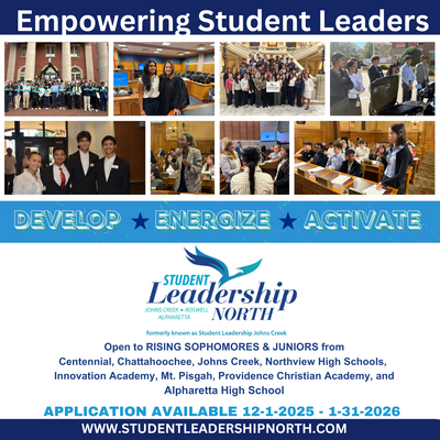We are thrilled to announce that applications for the 2026-27 program year are now open! This year, we have become a more regional program, thus our new name STUDENT LEADERSHIP NORTH. Our network of schools includes: Alpharetta High School, Centennial, Chattahoochee, Johns Creek, Northview High Schools, Mt. Pisgah, Providence Christian - Johns Creek, and Innovation Academy.